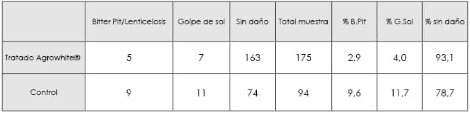 Para cuantificar el efecto de Agrowhite®, se realizó una evaluación visual de cada uno de los frutos de la muestra, tanto del sector tratado como el testigo.